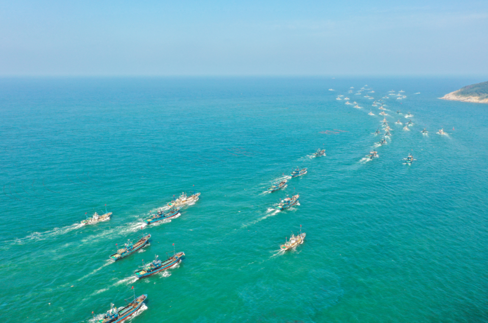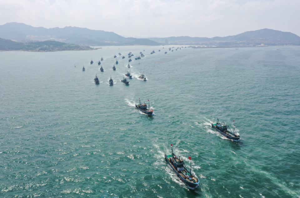 9月1日中午12时,山东省为期4个月的伏季休渔期结束,黄渤海海域正式开海。当天上午在中心渔港内,渔民为渔船装载出海物资,做最后的整理和装载工作。码头上人群熙熙攘攘,一辆辆拖着五、六米长的运冰车穿梭在人流中,将大量冰块装入渔船的货仓。岸边的起重机向船上运送渔网、缆绳等捕鱼设备。出海的船分为近海捕捞和远洋捕捞,在近海捕捞的渔民一般一周左右就能回来,小点的船一两天就可以往返一次。而对于那些几个月都在海上漂泊的远洋渔民而言,零食和烟酒是他们出海时不可或缺的“宝贝”。正午12时整,渔港内的百艘渔船发动引擎,顺序出海。渔船排成长队,浩浩荡荡有几百米。