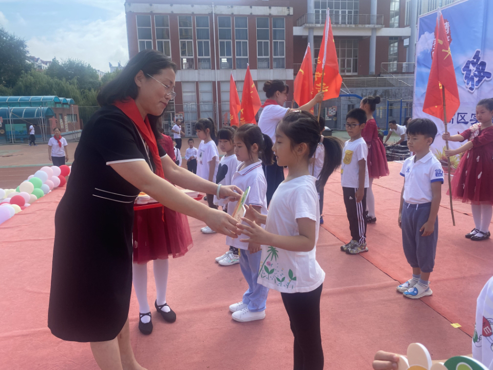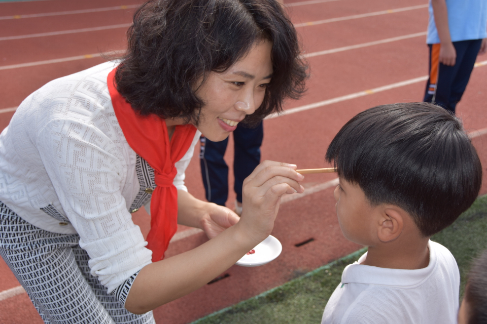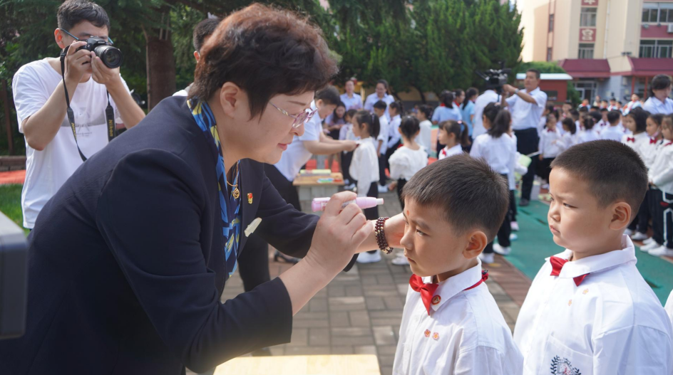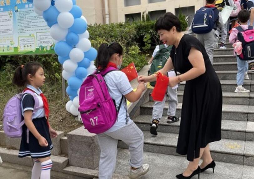 恒山实验学校校长为学生送祝福,引导学生快乐入学。