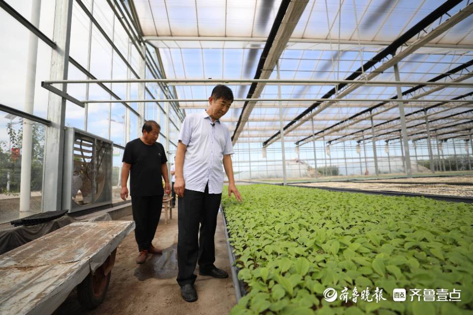 (经过20多年发展,耿店建设了大棚产业“一条龙”模式。耿遵珠(右)在村里种苗厂查看长势。)