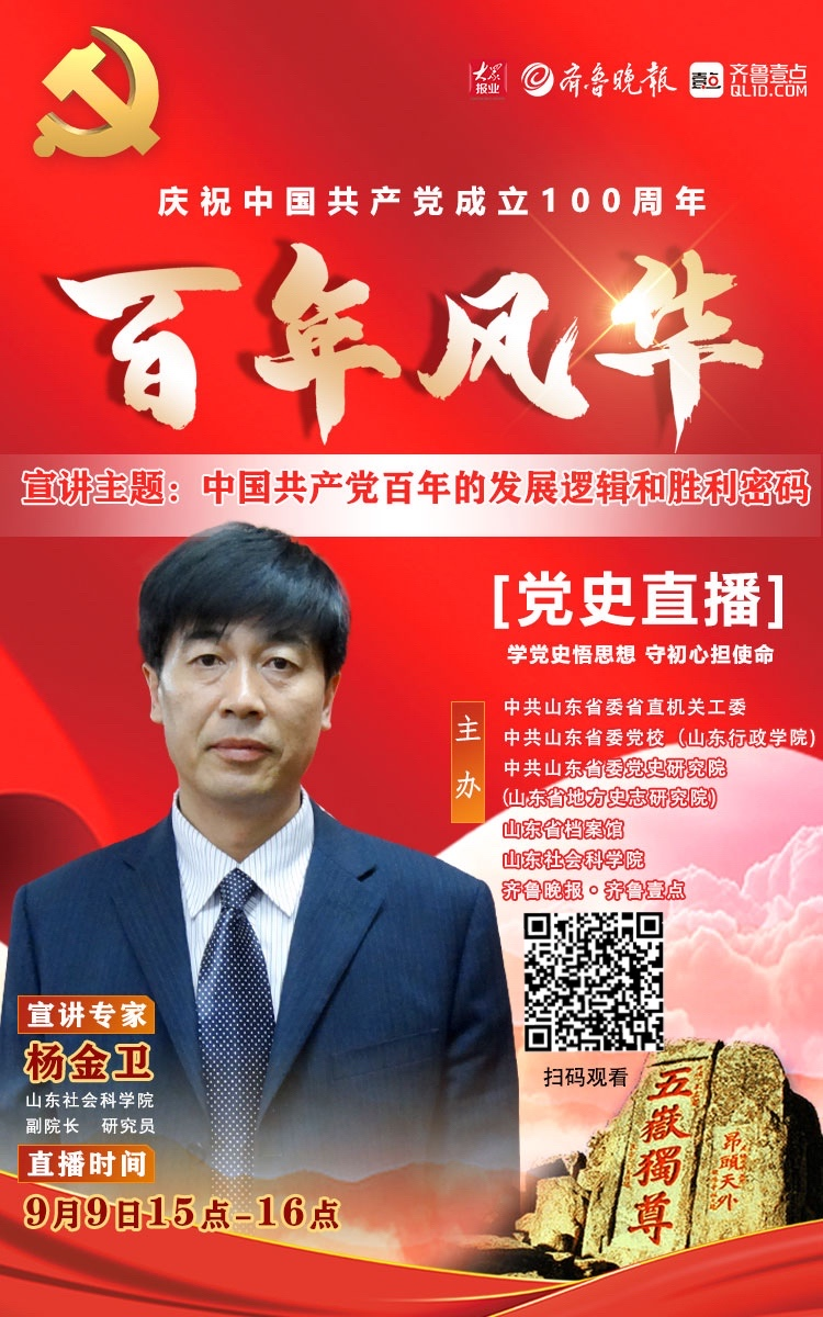 直播海报14|杨金卫:《中国共产党百年的发展逻辑和胜利密码》 大众报业·齐鲁壹点 2021-09-09 1210 学党史悟思想,守初心担使命。中共山东省委省直机关工委、中共山东省委党校、中共山东省委党史研究院(山东省地方史志研究院)、山东省档案馆、山东社会科学院与齐鲁晚报·齐鲁壹点联合主办《“百年风华”党史直播》。第14期直播嘉宾杨金卫:《中国共产党百年的发展逻辑和胜利密码》。 责任编辑:李和晴