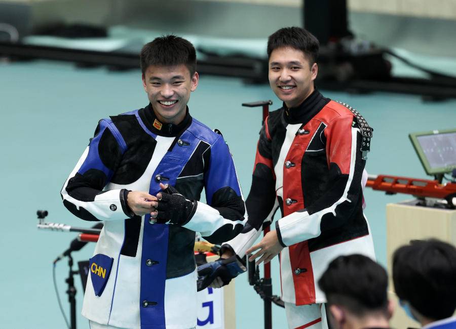 十四运射击男子10米气步枪决赛,张常鸿、杨皓然赛后很轻松。 IC photo供图
