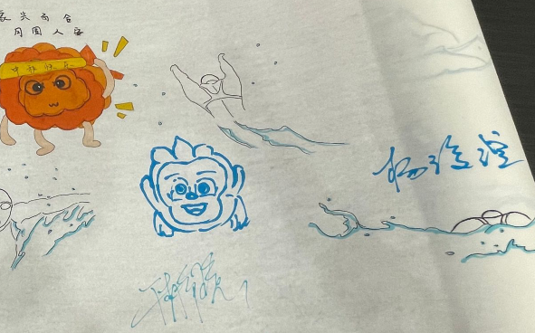 赛前发布会开始前,杨浚煊接受场馆工作人员的邀请,在发布会的场边留下了自己的“大作”。自游泳馆首日举办比赛以来,不少奖牌获得者被邀请在白色画卷上留下自己的画作。