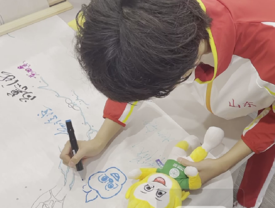 杨浚瑄拿起桌子上的全运会吉祥物之一“金金”,开始一笔一划认真画起来。“你们会等着我吗?我可能会画得有点慢。”起笔后的杨浚瑄,还在担心自己会影响发布会的进度。但其实,现场所有人都不忍打扰她的认真。