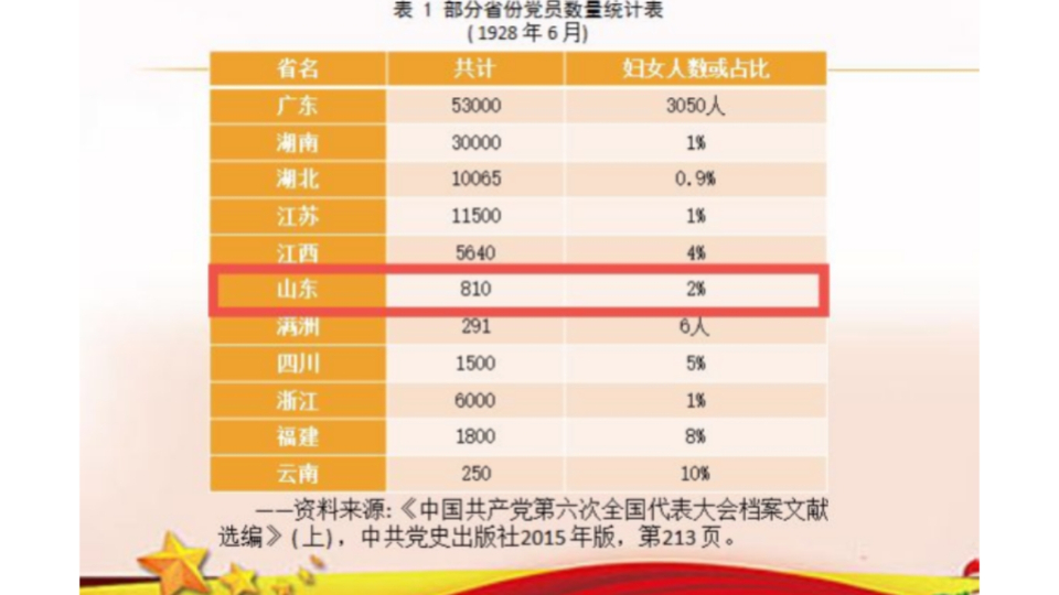 咱们再看另一组数字。1928 年6月中共六大的相关统计显示,当时各地女党员人数不超过党员总数的 10% ,甚至有些地区仅占 1% 左右。这是一份整理的1928 年6月的部分省份党员数量的统计表,大家看,山东当时共有党员810名,女性党员占2%,估算下,也就有十六七人吧。