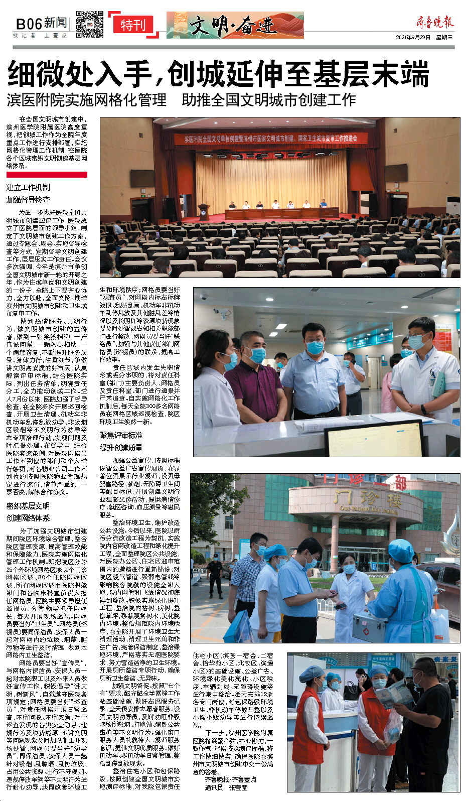 在全国文明城市创建中,滨州医学院附属医院高度重视,把创城工作作为全院年度重点工作进行安排部署,实施网格化管理工作机制,在医院各个区域密织文明创建基层网络体系。