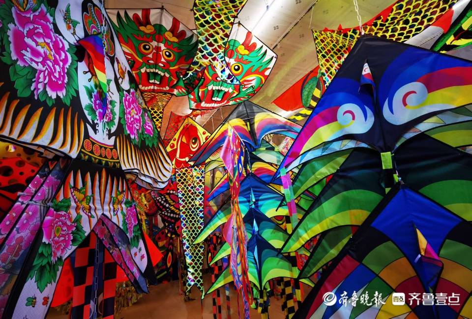 在王家庄子村国言风筝厂,挂着款式各异的风筝,满屋子300多个花型的风筝几乎都不重样。