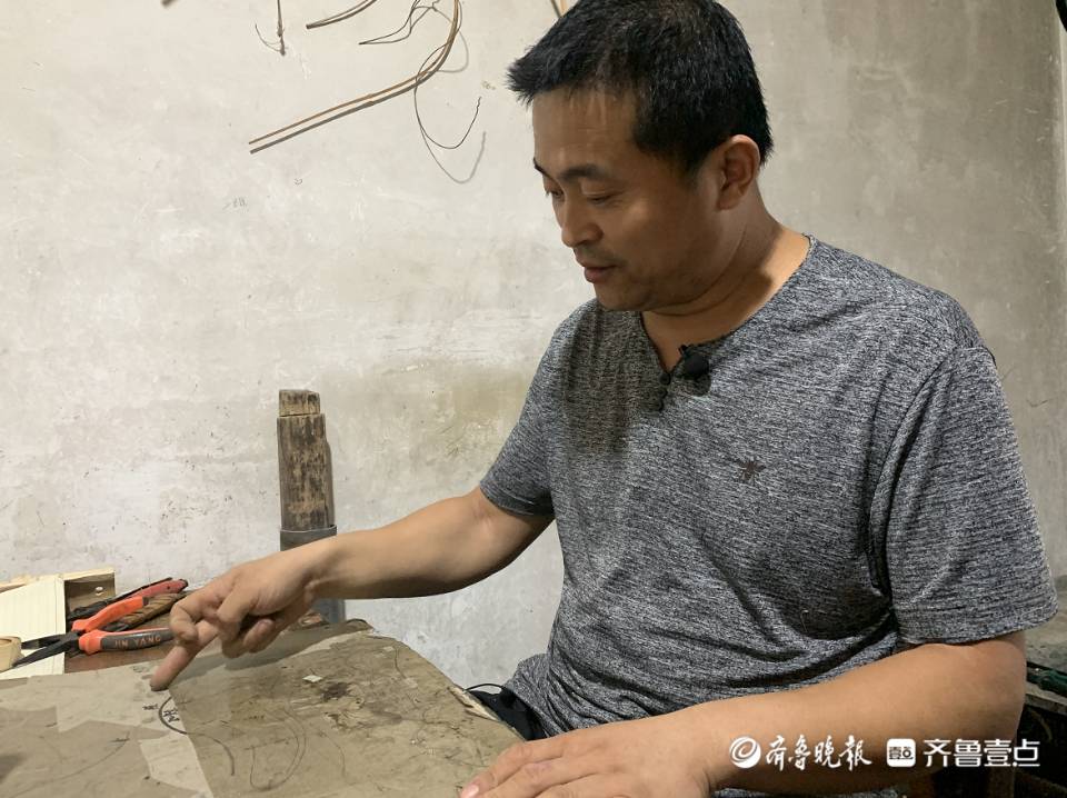 在一个普通的农家小院,王兴胜正在做龙头风筝的骨架。院门口堆着的竹子,就是他扎风筝骨架所用的原材料。竹子都是从南方运来的,而且得要秋天的竹子,因为这时候的竹子韧性好,再就是方便去掉外皮,容易粘合。王兴胜今年45岁,从16岁开始就跟着父亲学着做风筝。王兴胜说,入门的基本功就是劈竹子。在这个过程中,稍有不慎就会被竹子或者刀子划伤。扎制风筝首先要制作竹坯,将竹子劈开,去掉内层,还要用刮刀刮去外层的“毛坯”。王兴胜右手拿起特制的刀具,左手扶着两厘米宽左右的竹条,往下一拉就劈成了几毫米宽的竹条,动作十分娴熟。