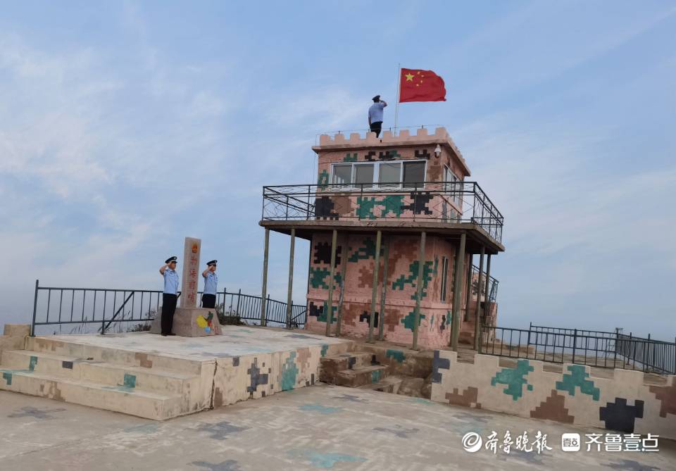 10月1日早上6点30分,烟台市公安局隍城海岸派出所民警早早来到渤海前哨,在渤海深处升起国旗迎接新中国生日的到来。伴随着嘹亮的国歌声,全体人员列队整齐,面向国旗敬礼,他们昂首挺胸,神情庄重。在国庆节当天,五星红旗在渤海深处飘扬。