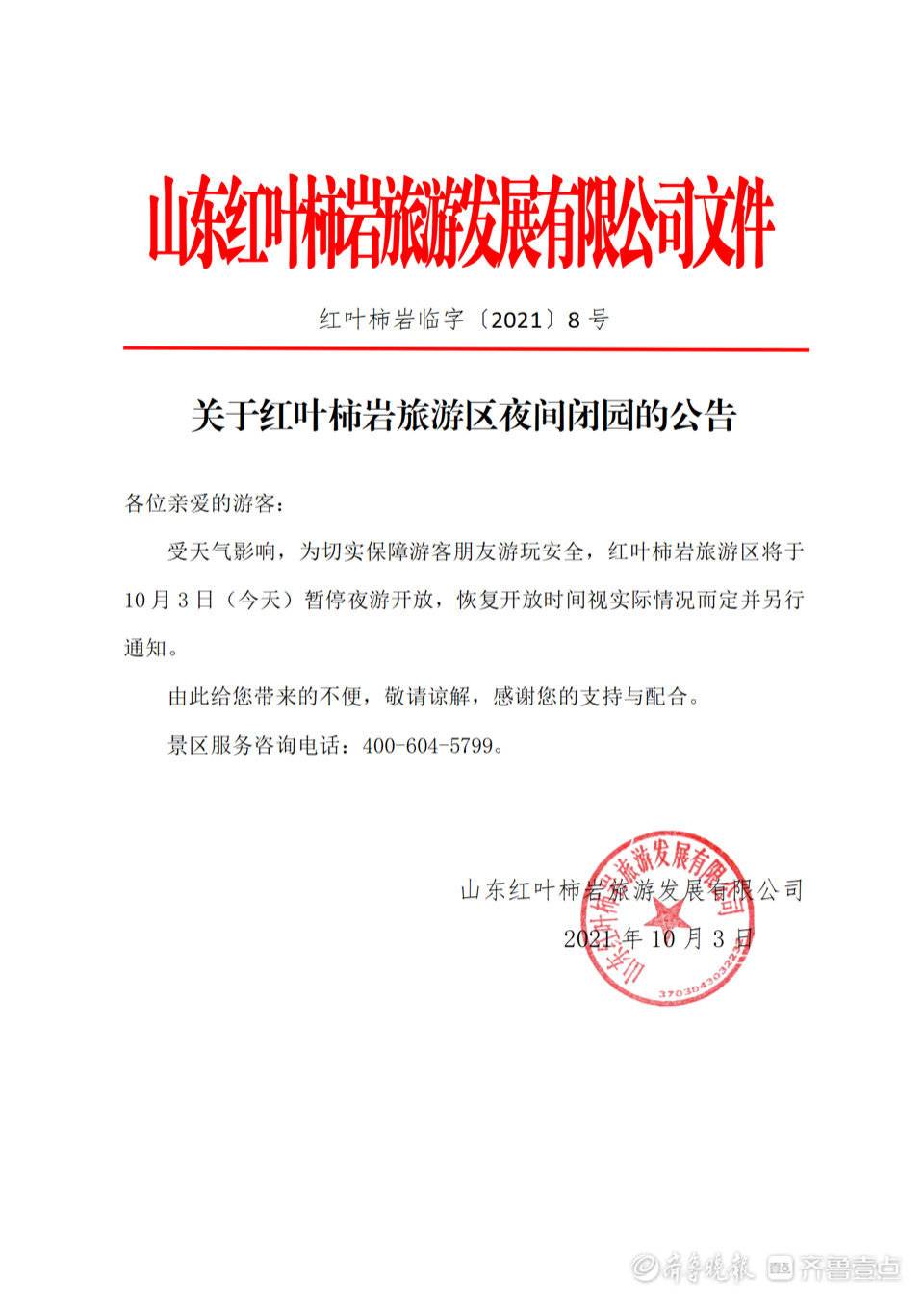 注意!大雨将至,红叶柿岩旅游区夜间闭园,开放时间再通知 大众报业·齐鲁壹点 2021-10-03 4740 齐鲁晚报·齐鲁壹点记者 张晓光 通讯员 赵雨萍 10月3日,博山鲁商红叶柿岩旅游区发布一则夜间闭园通告。 通告显示,因受天气影响,预计近期淄博市大部分地区有中雨到大雨。 红叶柿岩旅游区将于2021年10月3日暂停夜游开放,具体恢复开放时间视实际天气情况再另行通知。 夜间闭园通告 责任编辑:曲惠莹