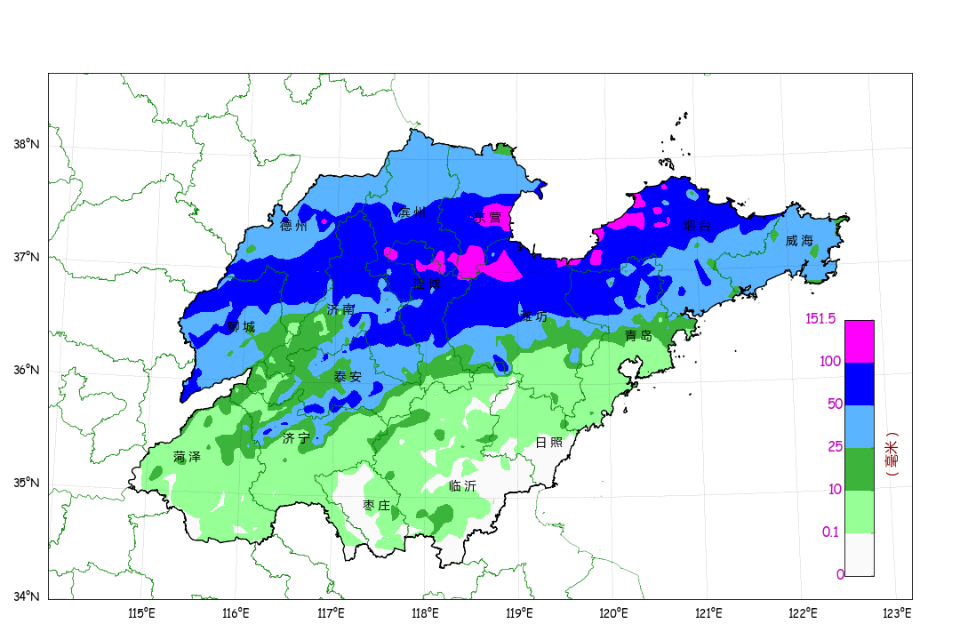 其中,超过150.0 毫米的有1个站,100.0-150.0 毫米的45个,50.0-100.0 毫米的454个,25.0-50.0 毫米的437个,排在前3位的是:东营广饶西刘桥151.5 毫米、东营垦利永安144.0 毫米和烟台莱州虎头崖137.1 毫米。