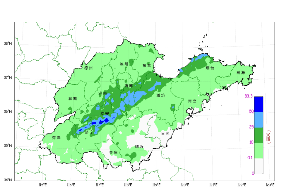 过去24小时降水量,也就是4日16时至5日16时,全省共有117县(区市)、1559乡镇出现降水,平均降水量6.6毫米,折合水量约10.4亿方。各市平均量位居前三的是泰安18.1 毫米、淄博16.1 毫米、济南12.5 毫米,其他各市降水量在10毫米以下。超过50.0毫米的有11个站,25.0-50.0毫米的100个,10.0-25.0毫米的286个,排在前3位的是:泰安宁阳东庄83.3毫米、济宁曲阜吴村78.6毫米和泰安宁阳东疏70.2毫米。