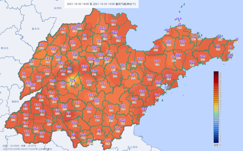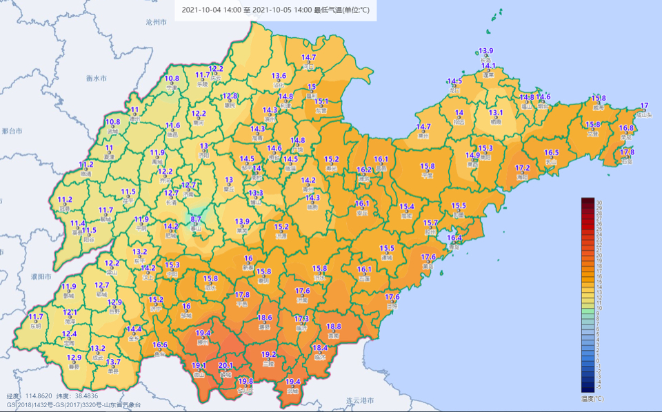 10月5日16时50分,山东省气象台发布天气实况和预报。