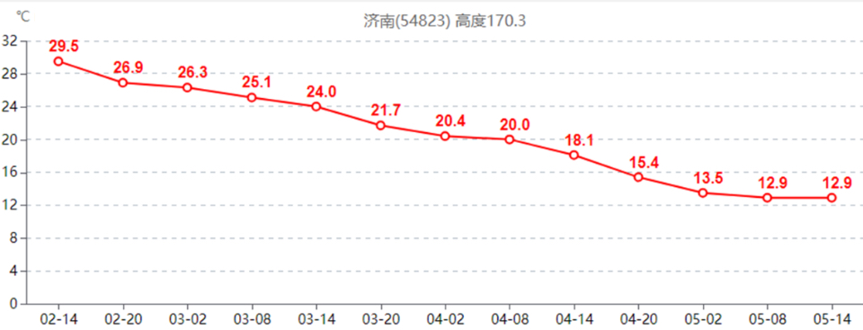 在大风天气的同时,我省气温自3日起逐渐下降。3日最低气温,鲁西北和鲁中地区多在20~21℃,鲁南和半岛沿海地区在22~23℃;5日最低气温,鲁西北和鲁西南地区多在11~12℃,鲁东南和半岛沿海地区多在16~18℃。3-5日我省西部地区的最低气温降温幅度达8~10℃,其他大部地区降温幅度6~8℃。其中,济南3日14时气温为24.0℃,5日14时降至12.9℃,48小时降温幅度达11.1℃。
