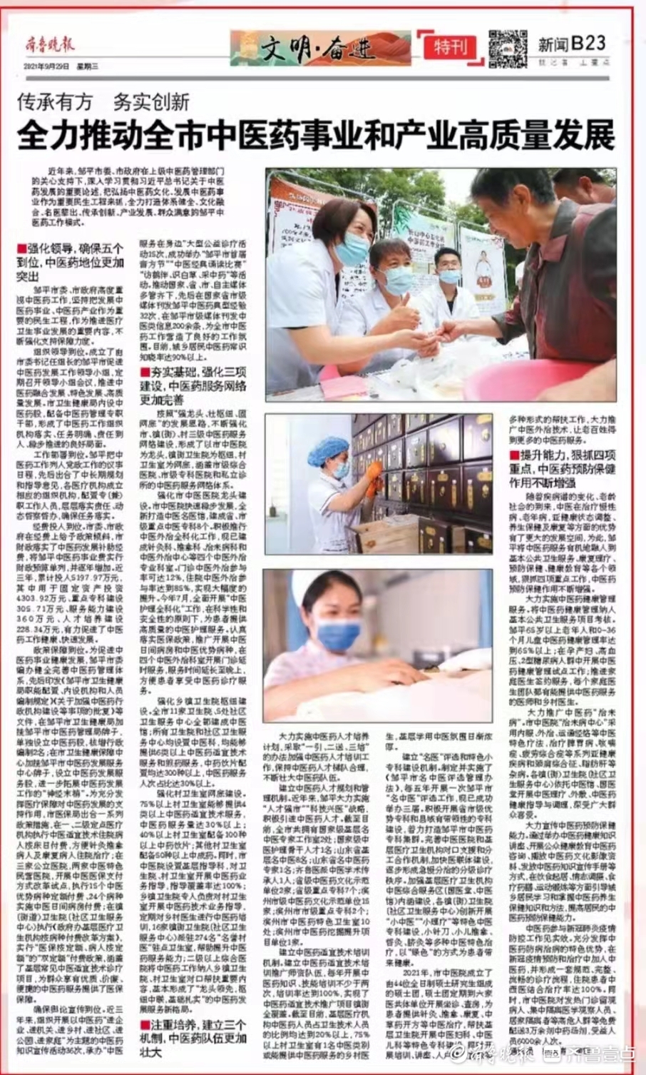 近年来,邹平市委、市政府在上级中医药管理部门的关心支持下,深入学习贯彻习近平总书记关于中医药发展的重要论述,把弘扬中医药文化、发展中医药事业作为重要民生工程来抓,全力打造体系健全、文化融合、名医辈出、传承创新、产业发展、群众满意的邹平中医药工作模式。