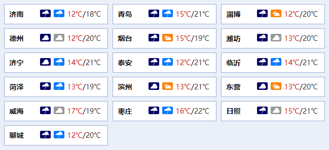 全省天气阴,鲁中、鲁南和半岛地区有小雨,其他地区局部有小雨。北风,鲁西北的东部、鲁中的北部和半岛地区3~4级增强到4~5级阵风6~7级,其他地区3~4级。 最低气温:鲁中山区11℃左右,鲁东南和半岛地区15℃左右,其他地区13℃左右。 最高气温:鲁中山区18℃左右,其他地区20℃左右。