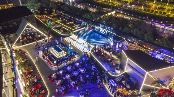 在露台上的迈阿密热带雨林,热情洋溢的椰子树随风摇曳,红黑配色的桌椅充满摩登与未来感。M-SKY露台酒吧由庭院区、观景台、水景区、吧台区等六大板块组成,放眼看去满是旖旎风光。