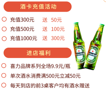 而夜晚散步在浪漫的泉城路周边,朋友聚餐烧烤啤酒更是不能少。西门九号精酿酒馆也推出了超值优惠福利,只要领取黑骑士卡后进店消费,就再加送一瓶价值99元的果酒!并有各种充值福利活动,现场还可以点歌+唱歌,气氛十分nice了。