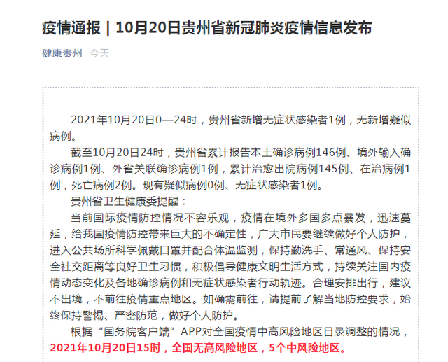 2021年10月20日0—24时,贵州省新增无症状感染者1例,无新增疑似病例。