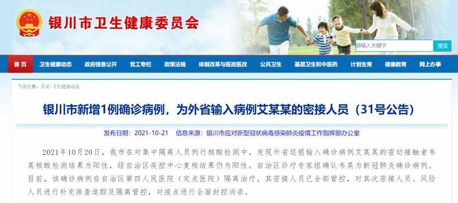 2021年10月20日,银川市在对集中隔离人员例行核酸检测中,发现外省返银输入确诊病例艾某某的密切接触者韦某核酸检测结果为阳性,经自治区疾控中心复核结果仍为阳性。自治区诊疗专家组确认韦某为新冠肺炎确诊病例。目前,该确诊病例在自治区第四人民医院(定点医院)隔离治疗。其密接人员已全部管控,对其次密接人员、风险人员进行补充排查追踪及隔离管控,对疫点进行全面封控消杀。