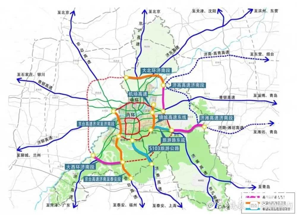 在干线公路方面,济南建设完善畅安舒美的高速公路网络,推进济青高速中线、济南至微山、济南至高青、高青至商河、济南绕城高速二环线等高速公路规划建设。建成济青中线、济南至高青、高青至商河高速公路及绕城高速二环线西环段、北环段,扩建京台高速(济南至泰安段)、绕城高速东线及南线,规划建设济南至微山、宁津等方向高速公路。实施G104线、G220线、G309线、G308线、G341线、G340线以及S103线、S241线等国省道部分路段改扩建。