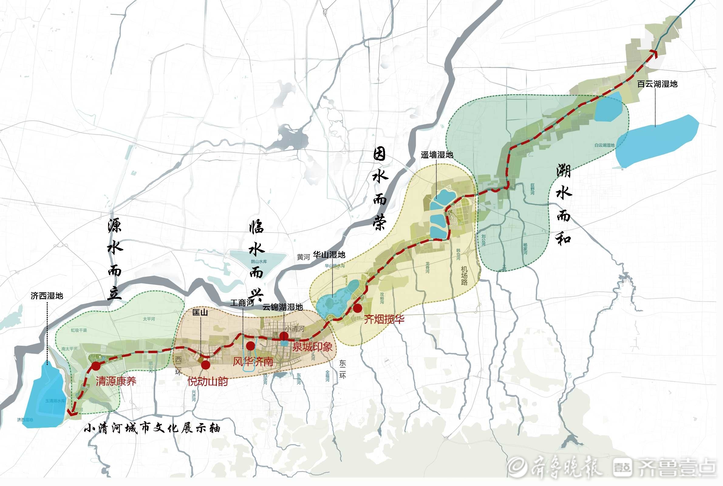 2018年10月16日,济南市自然资源和规划局官网发布《水清、岸绿、河畅、宜游 ——小清河生态景观带总体规划及景观设计方案》,该方案串联了济西湿地、云锦湖湿地、华山湿地、清河湿地及白云湖湿地,河道主干长度约70公里,用“一带四区五园八大风貌段”实现小清河重生。
