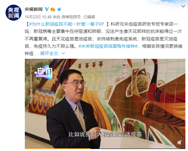 为什么新冠疫苗不能一针管一辈子?专家解读 央视新闻 2021-10-23 7.1万 科研攻关组疫苗研发专班专家邵一鸣:新冠病毒主要集中在呼吸道和肺部,没法产生像天花那样的抗体能得过一次不再重复得。且天花疫苗是活疫苗,会持续刺激免疫系统;新冠疫苗是灭活疫苗,免疫持久力不那么强。未来新冠疫苗或需每年接种,根据变异情况更换接种疫苗的毒株。 (央视新闻) 责任编辑:朱洪蕾
