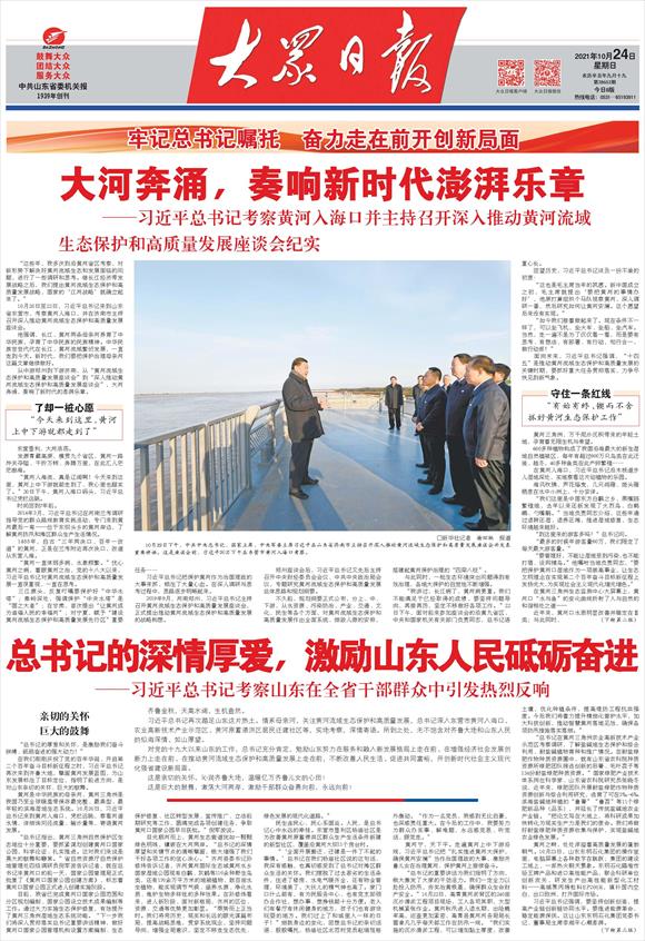 金秋时节,习近平总书记再次来到山东考察。对山东工作,他充分肯定;谈未来发展,他充满期许,勉励山东努力在服务和融入新发展格局上走在前、在增强经济社会发展创新力上走在前、在推动黄河流域生态保护和高质量发展上走在前,不断改善人民生活、促进共同富裕,开创新时代社会主义现代化强省建设新局面。