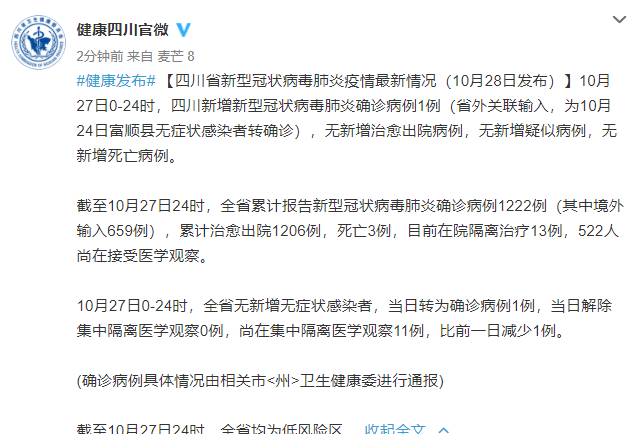 10月27日0-24时,四川新增新型冠状病毒肺炎确诊病例1例(省外关联输入,为10月24日富顺县无症状感染者转确诊),无新增治愈出院病例,无新增疑似病例,无新增死亡病例。