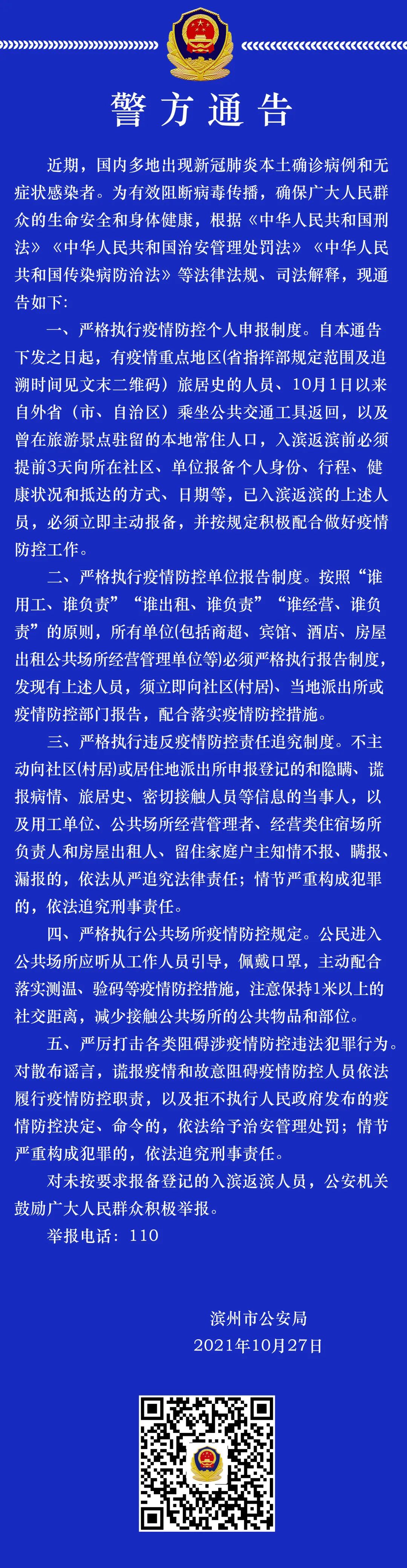 自本通告下发之日起,有疫情重点地区(省指挥部规定范围及追溯时间见文末二维码)旅居史的人员、10月1日以来自外省(市、自治区)乘坐公共交通工具返回,以及曾在旅游景点驻留的本地常住人口,入滨返滨前必须提前3天向所在社区、单位报备个人身份、行程、健康状况和抵达的方式、日期等,已入滨返滨的上述人员,必须立即主动报备,并按规定积极配合做好疫情防控工作。