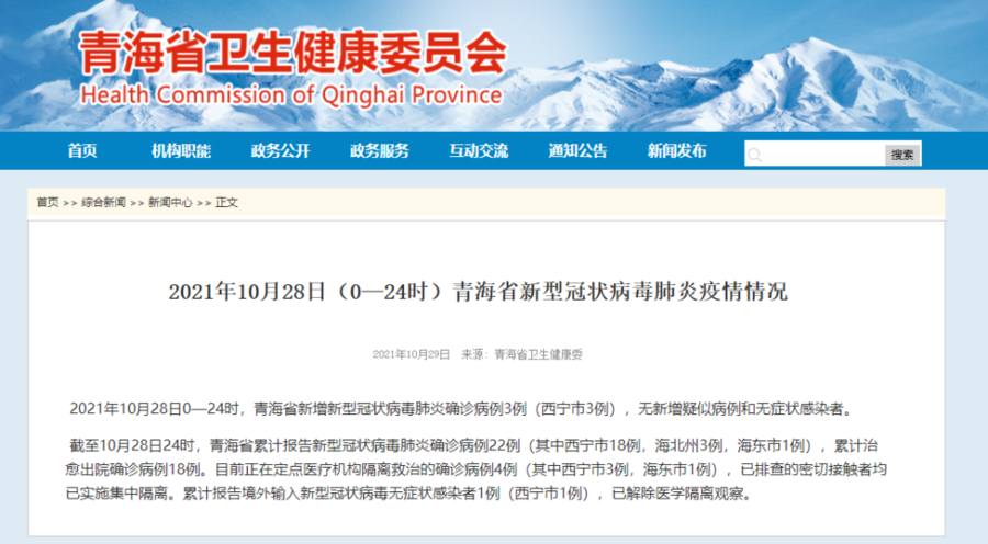 2021年10月28日0—24时,青海省新增新型冠状病毒肺炎确诊病例3例(西宁市3例),无新增疑似病例和无症状感染者。
