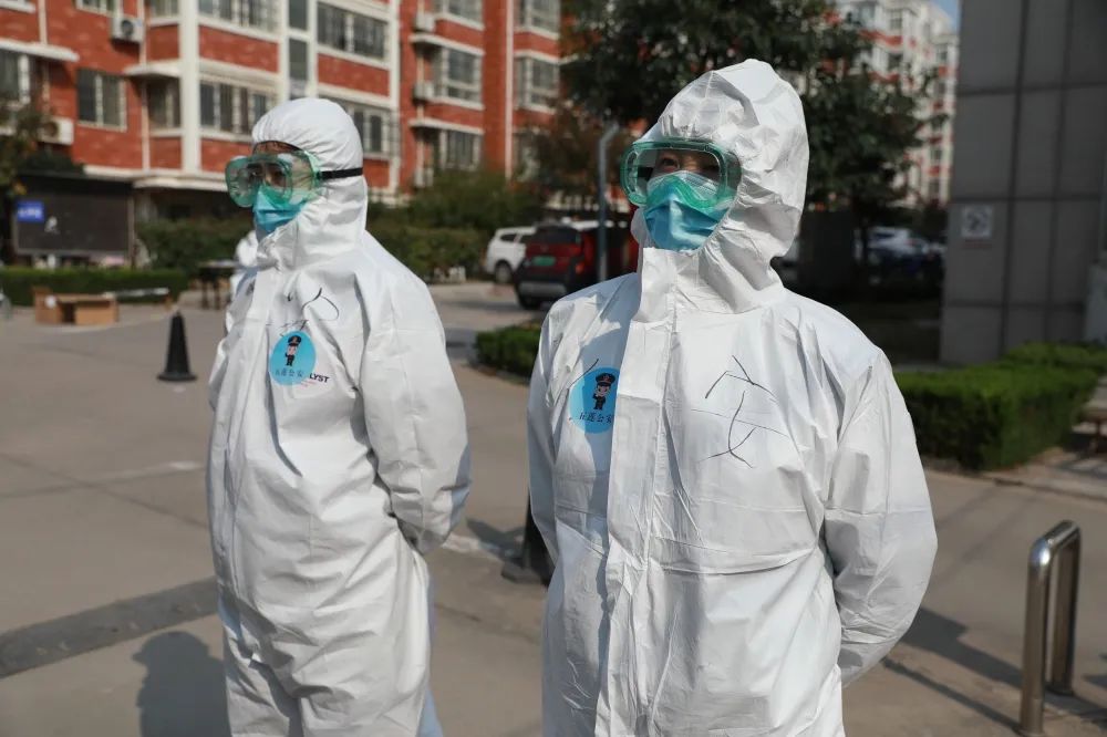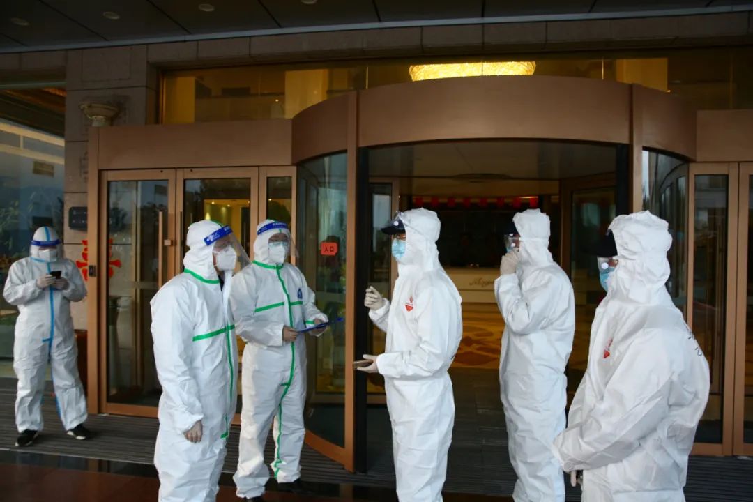这边穿防护服的人员一排而坐,他们全副武装。因为只有保护自己,才能更好地守护山城!
