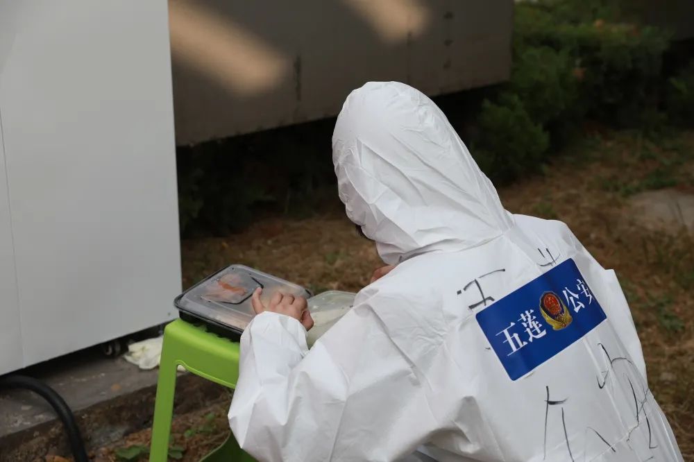 工作人员的午餐已送到,民警们相互给对方消毒,也开始了轮换着就地就餐。