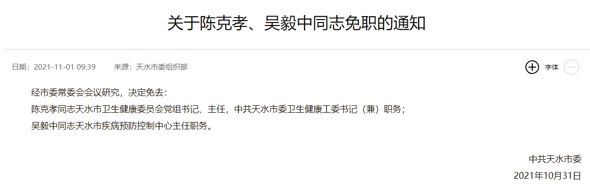 甘肃天水市卫健委主任陈克孝、疾控中心主任吴毅中被免职 天水市委组织部 2021-11-01 5015 据天水市委组织部网站消息,经市委常委会会议研究,决定免去: 陈克孝同志天水市卫生健康委员会党组书记、主任,中共天水市委卫生健康工委书记(兼)职务; 吴毅中同志天水市疾病预防控制中心主任职务。 (天水市委组织部网站) 责任编辑:吴佳