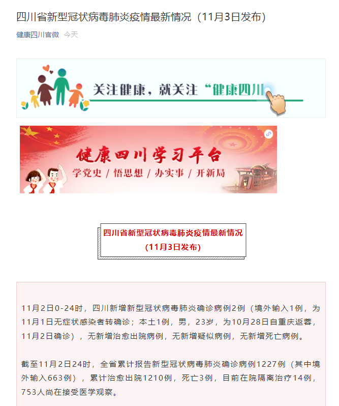 11月2日0-24时,四川新增新型冠状病毒肺炎确诊病例2例(境外输入1例,为11月1日无症状感染者转确诊;本土1例,男,23岁,为10月28日自重庆返蓉, 11月2日确诊),无新增治愈出院病例,无新增疑似病例,无新增死亡病例。