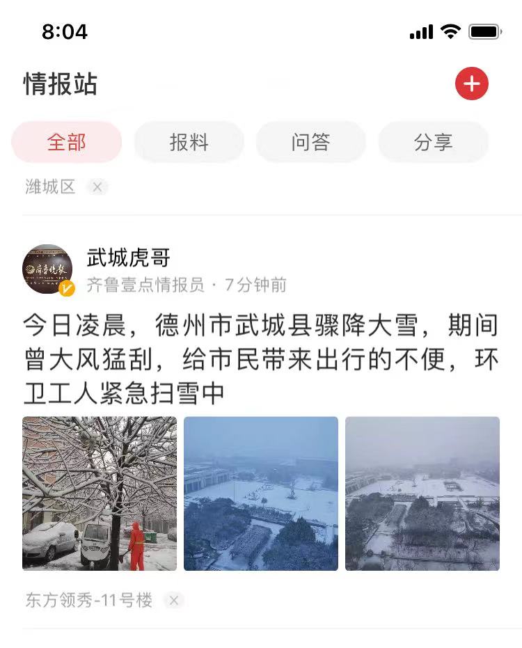 11月7日一早,山东各地的情报员们纷纷向齐鲁晚报官方客户端齐鲁壹点情报站发来情报,德州、聊城、济南开始下雪啦!