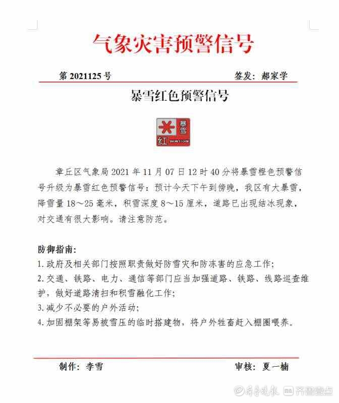 章丘区气象局于2021年11月7日12时40分,将暴雪橙色预警信号升级为暴雪红色预警信号:预计今天下午到傍晚,章丘区有大暴雪,降雪量18~25毫米,积雪深处8~15厘米,道路已出现结冰现象,对交通有很大影响。