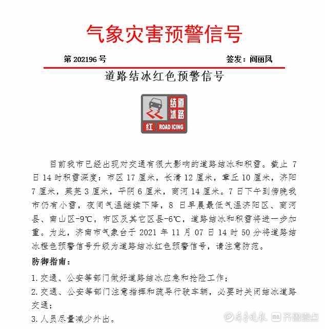 7日下午,济南市气象台变更发布道路结冰红色预警信号,目前济南已经出现对交通有很大影响的道路结冰和积雪。截至7日14时积雪深度,市区17厘米,长清12厘米,章丘10厘米,济阳7厘米,莱芜3厘米,平阴6厘米,商河14厘米。7日下午到傍晚济南仍有小雪,夜间气温继续下降,8日早晨最低气温济阳区、商河县、南山区-9℃,市区及其它区县-6℃,道路结冰和积雪将进一步加重。