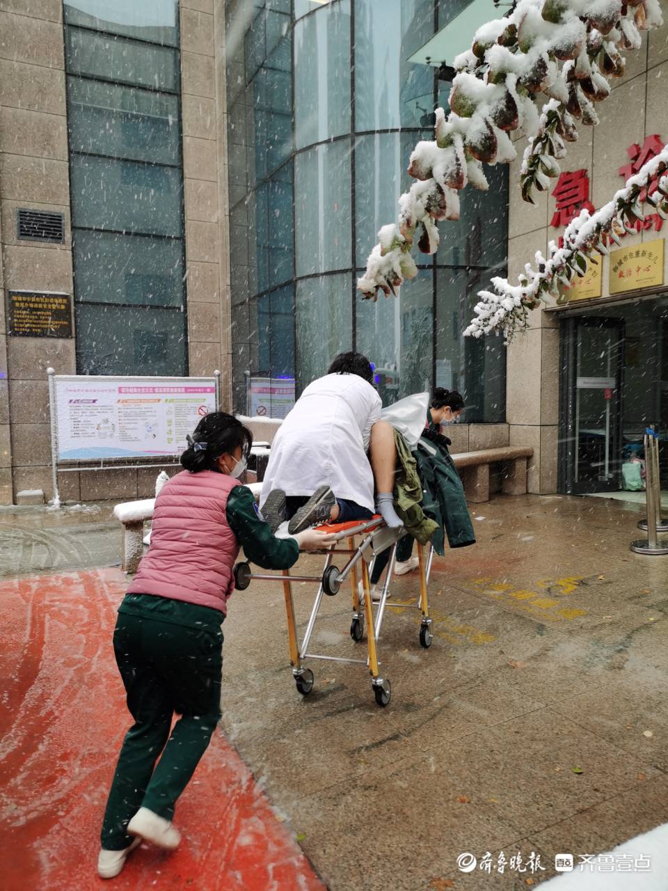 冒着鹅毛大雪,齐鲁晚报·齐鲁壹点记者来到医院,找到了照片中的三名医护人员:聊城市东昌府区妇幼保健院医生王沛沛、护师李文静、护师聂春晓,她们三人在当天上午成功救护一名待产的孕妇。医生王沛沛介绍,11月7日早晨6时50分,医院接120急救电话,阳谷一名孕妇突然临产急需救护,急诊科第一时间派120急救车前往救护,她和同事紧急随车前往。