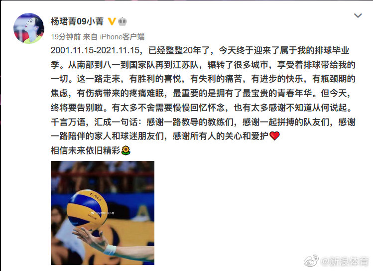 11月15日,中国女排副攻、八一女排队员杨珺菁发博正式宣布退役:“2001.11.15-2021.11.15,已经整整20年了,今天终于迎来了属于我的排球毕业季。有太多不舍需要慢慢回忆怀念,也有太多感谢不知道从何说起。千言万语,汇成一句话:感谢一路教导的教练们,感谢一起拼搏的队友们,感谢一路陪伴的家人和球迷朋友们,感谢所有人的关心和爱护,相信未来依旧精彩!”