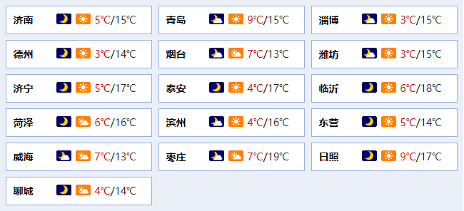 最低气温:鲁中地区3℃左右,其他地区5℃左右。
