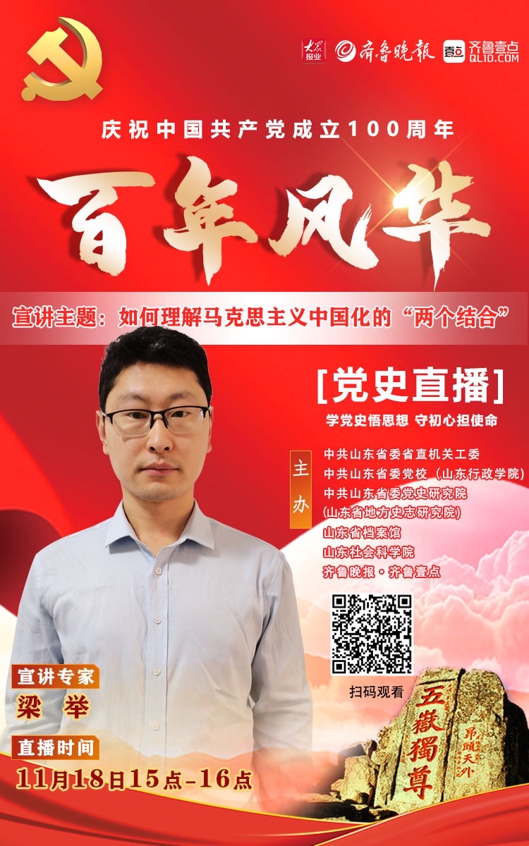 海报| 梁举 :《如何理解马克思主义中国化的“两个结合”》 党建亮点 2021-11-18 8941 学党史悟思想,守初心担使命。中共山东省委省直机关工委、中共山东省委党校、中共山东省委党史研究院(山东省地方史志研究院)、山东省档案馆、山东社会科学院与齐鲁晚报·齐鲁壹点联合主办《“百年风华”党史直播》。第19期直播嘉宾梁举:《如何理解马克思主义中国化的“两个结合”》 责任编辑:李和晴