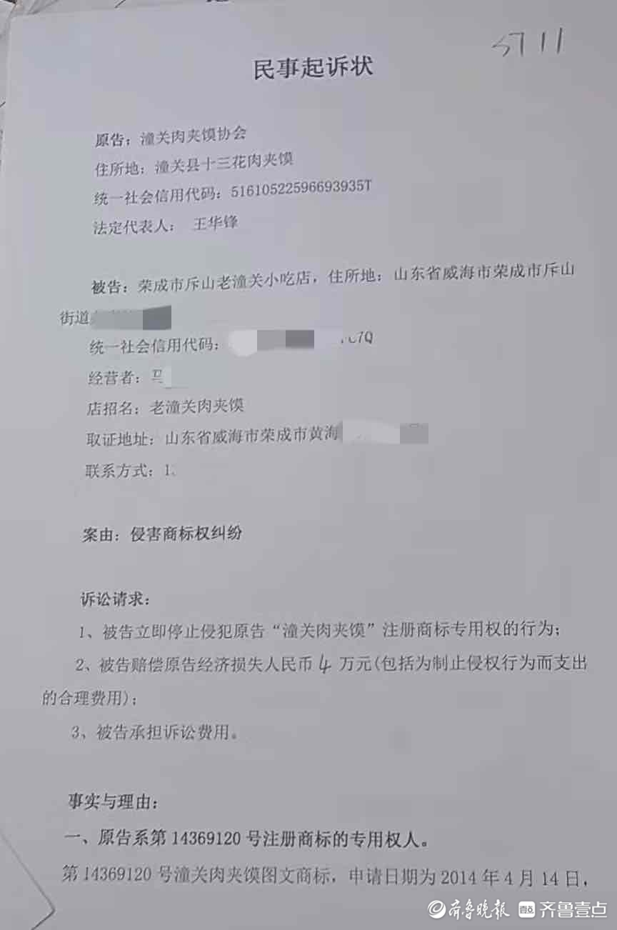 “开了三四年肉夹馍店,怎么就被起诉了呢?”今年7月初,威海荣成一家小吃店的店主毕卫卫忽然接到法院电话和起诉书:他的店名“斥山老潼关肉夹馍”侵权了一家名为“潼关肉夹馍协会”机构的注册商标。