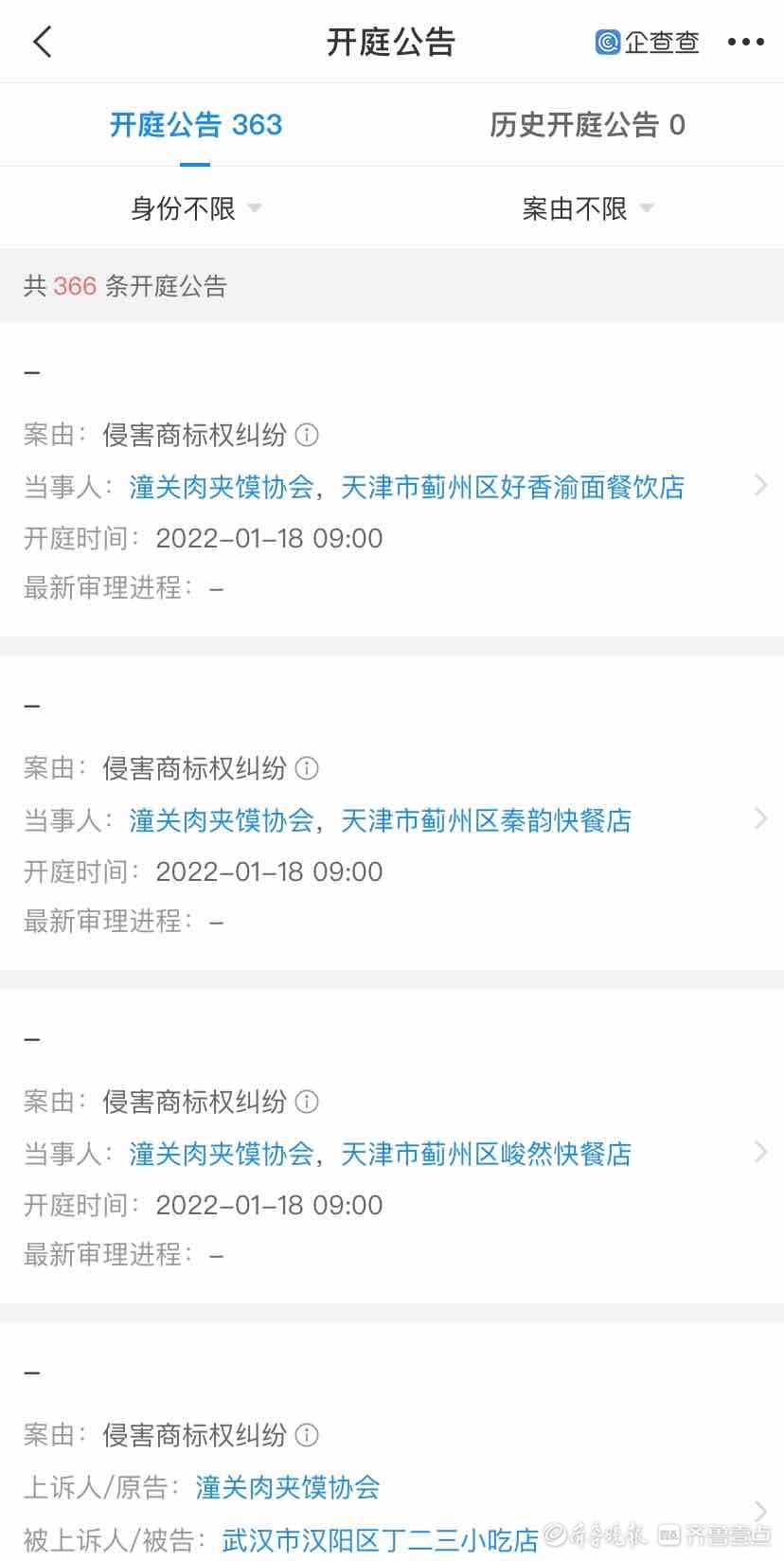 截至11月25日下午,企查查显示,跟潼关肉夹馍协会有关的开庭公告已经增长到了363条,基本都与侵害商标权纠纷有关。齐鲁晚报·齐鲁壹点记者发现,在这些开庭信息中,潼关肉夹馍协会均为原告,被告涉及全国至少18个省和直辖市,多个区县城市。其中山东的泰安、青岛和威海有多家商户显示成为了被告。