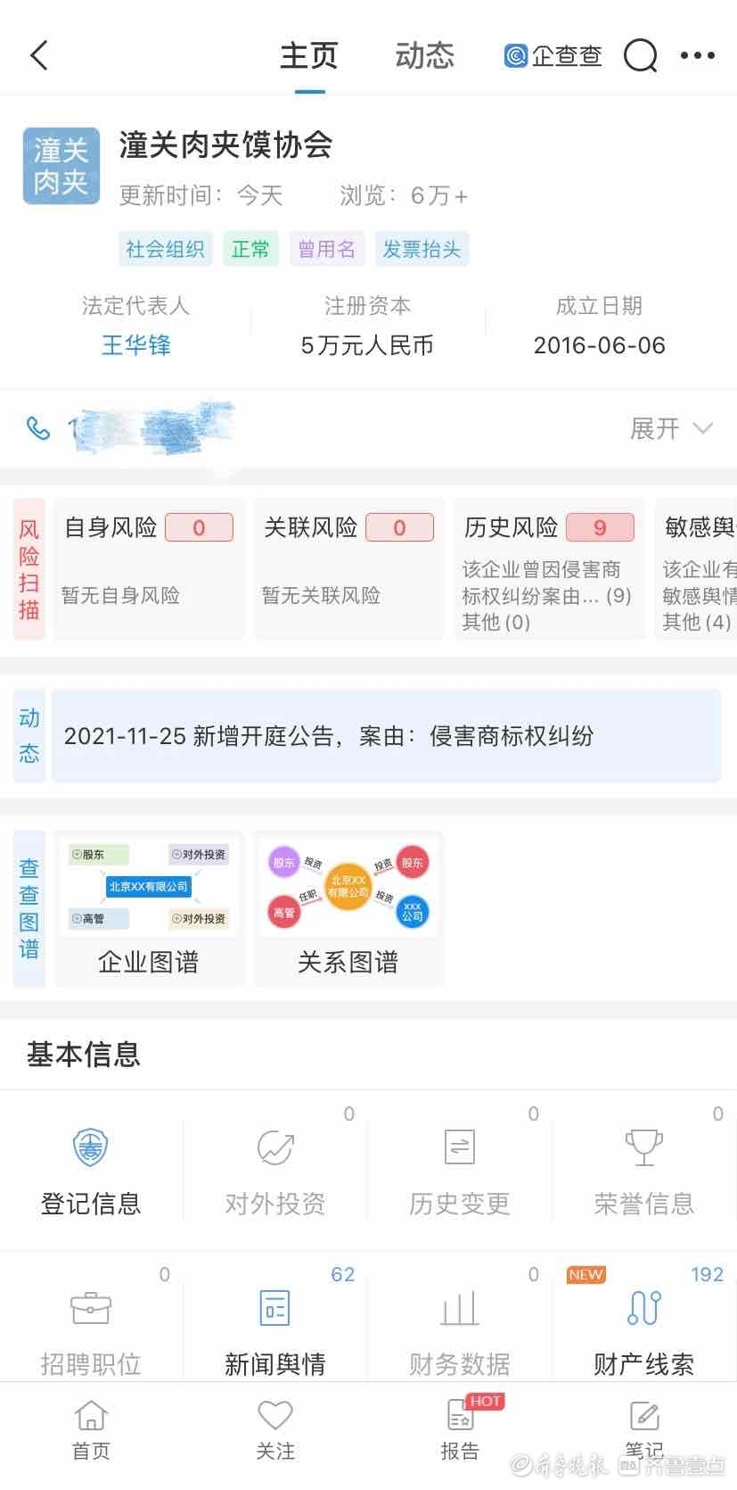 企查查显示,潼关肉夹馍协会成立于2016年6月6日,注册资本5万元,法定代表人为王华峰。社会组织类型为社会团体,业务范围包括潼关肉夹馍培训、推广、宣传。发证机关为潼关县民政局。该协会的历史名称为“老潼关小吃协会”。