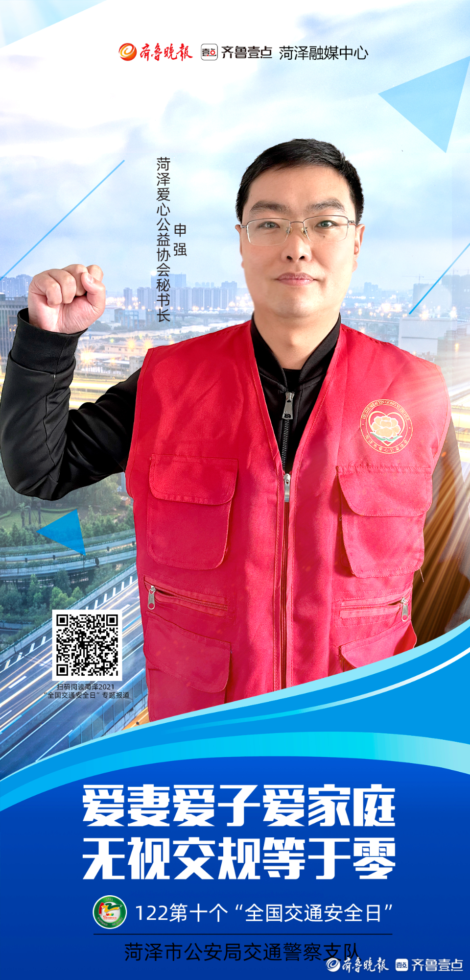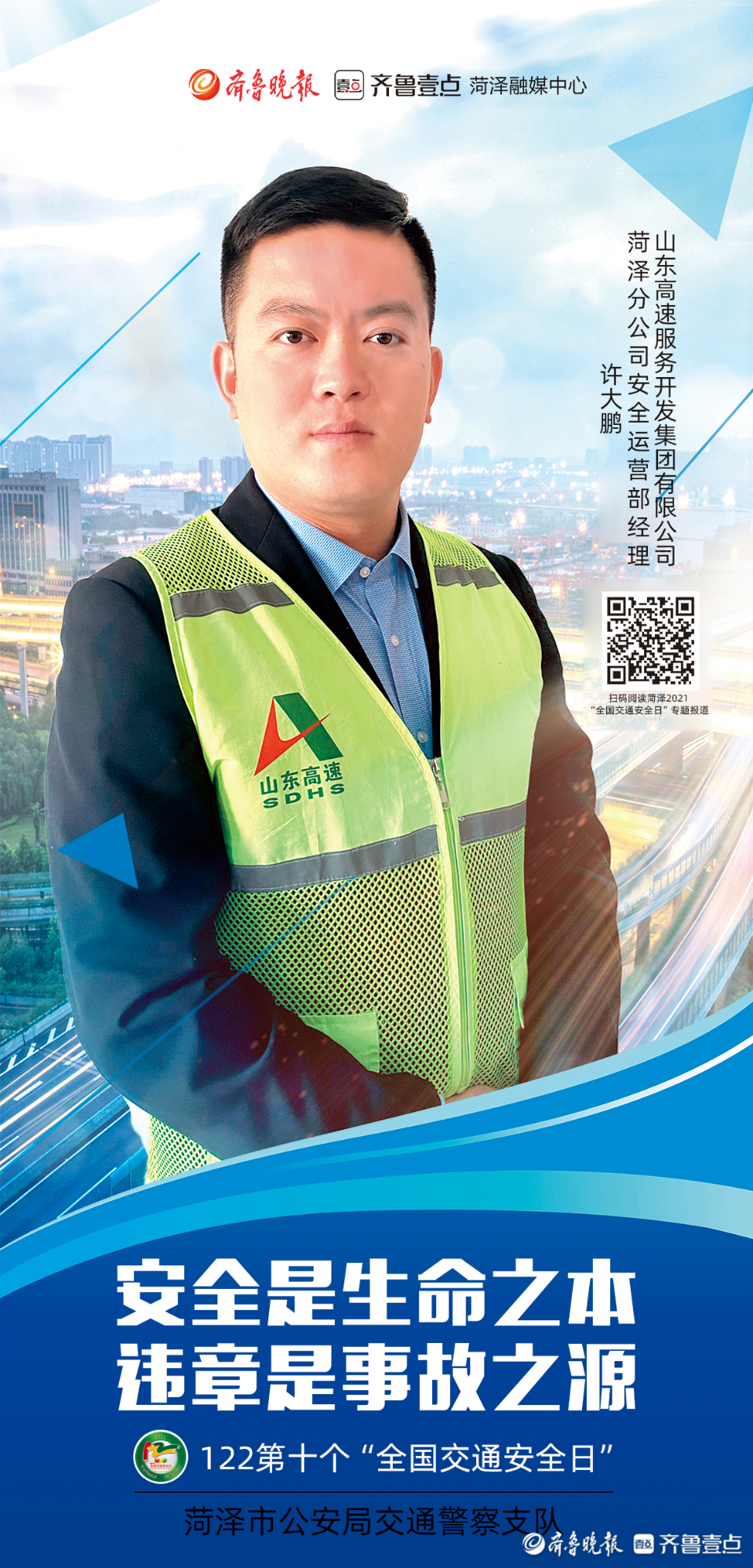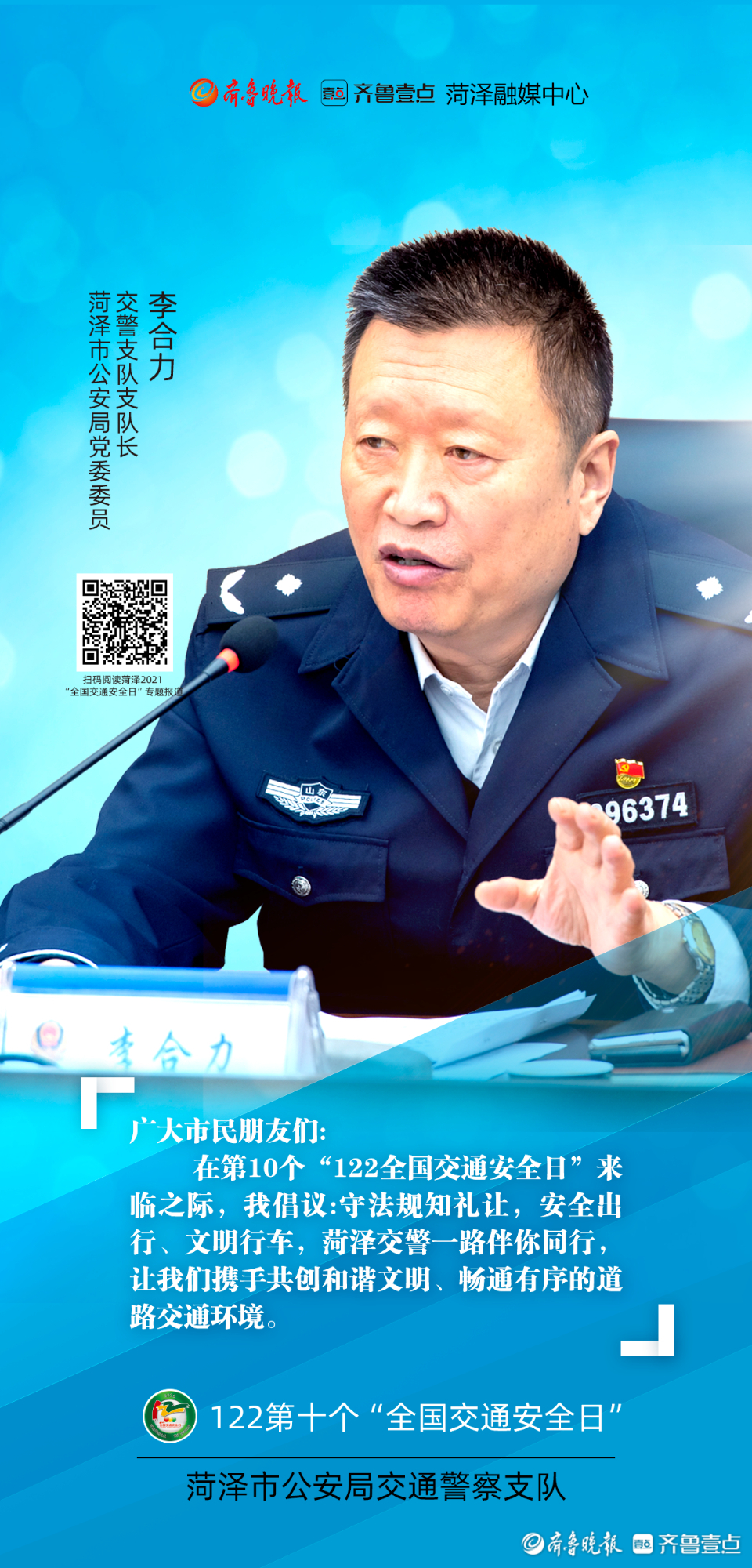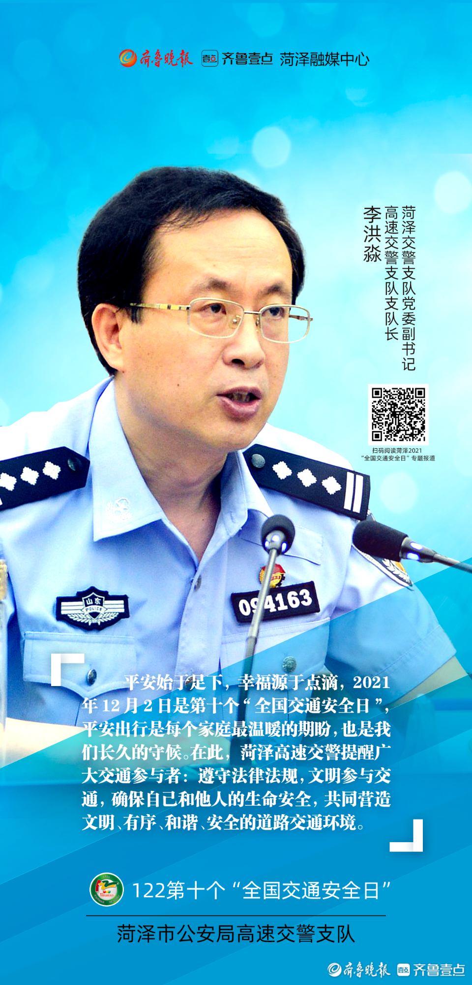 今年12月2日是第十个“全国交通安全日”。为进一步做好系列宣传活动,从源头上预防和减少道路交通事故,菏泽市公安局交通警察支队联合齐鲁晚报·齐鲁壹点菏泽融媒中心推出第十个“全国交通安全日”系列海报。海报以菏泽市公安局交警支队支队长李合力和菏泽市公安局高速交警支队支队长李洪淼的寄语为开篇,各行各业代表为“交通安全”代言,用通俗易懂的方式提醒市民交通安全的重要性。