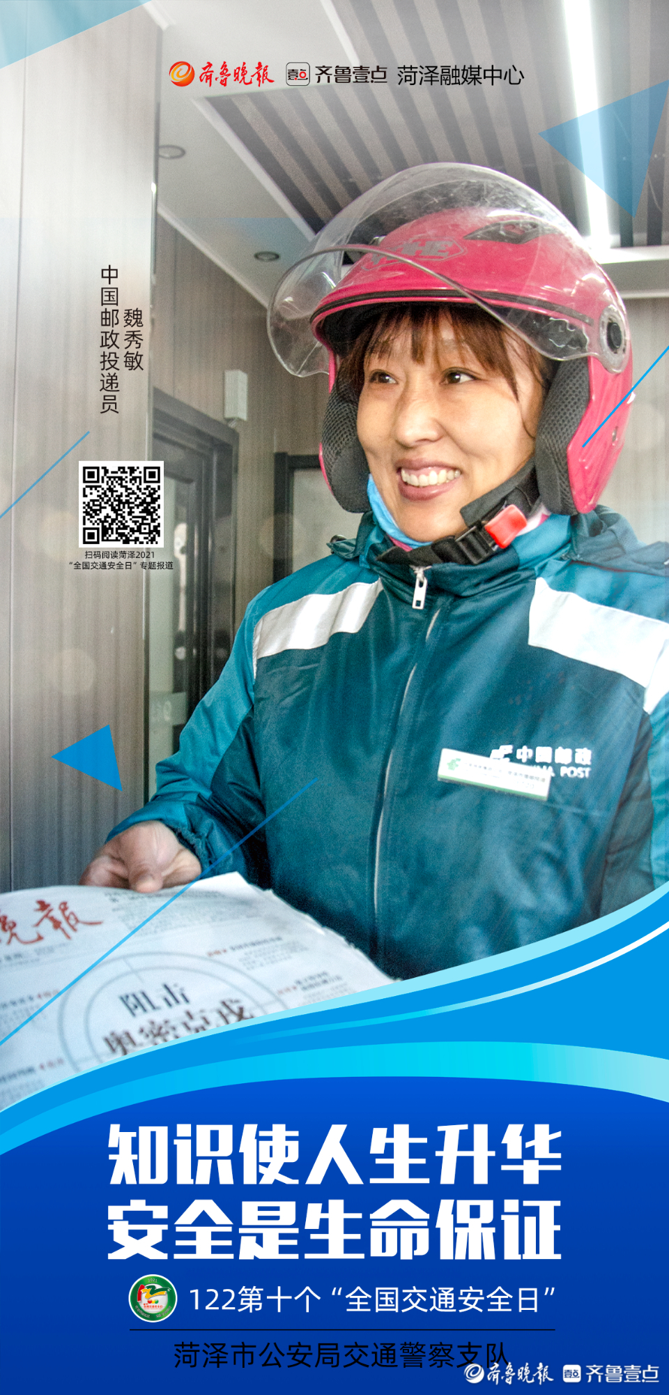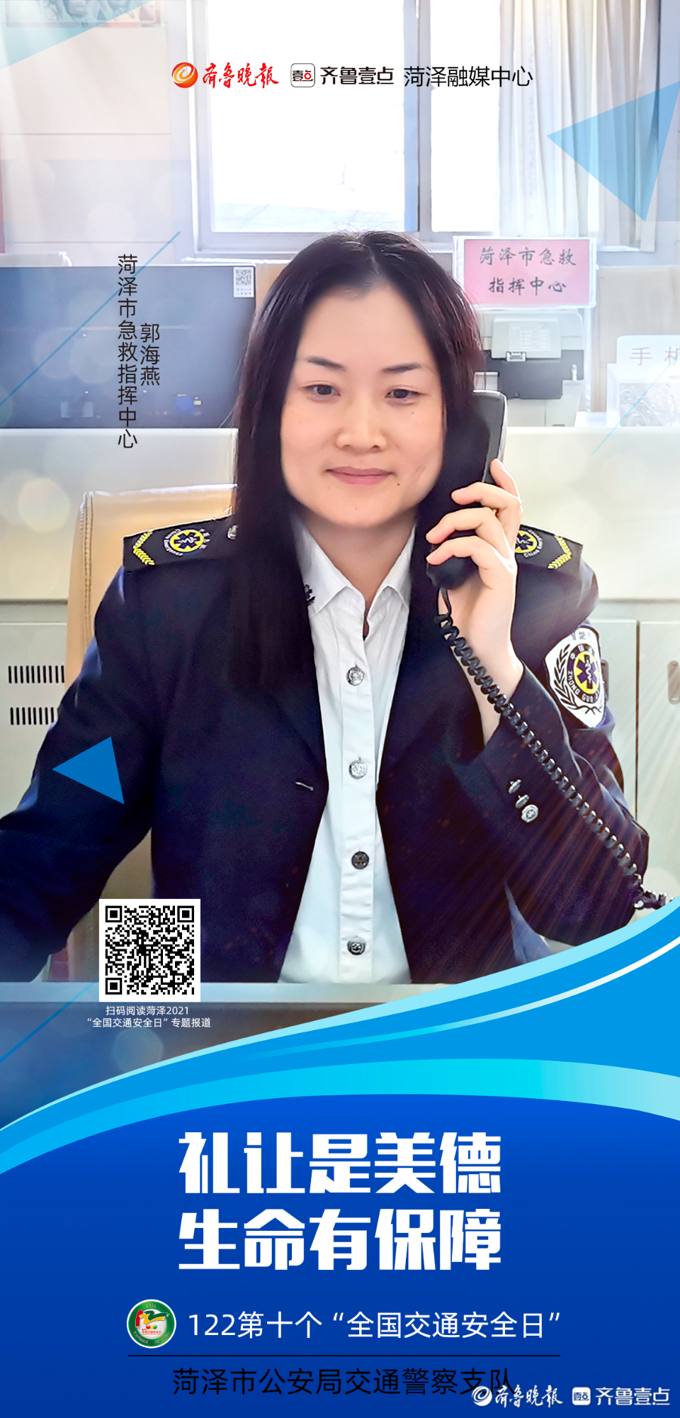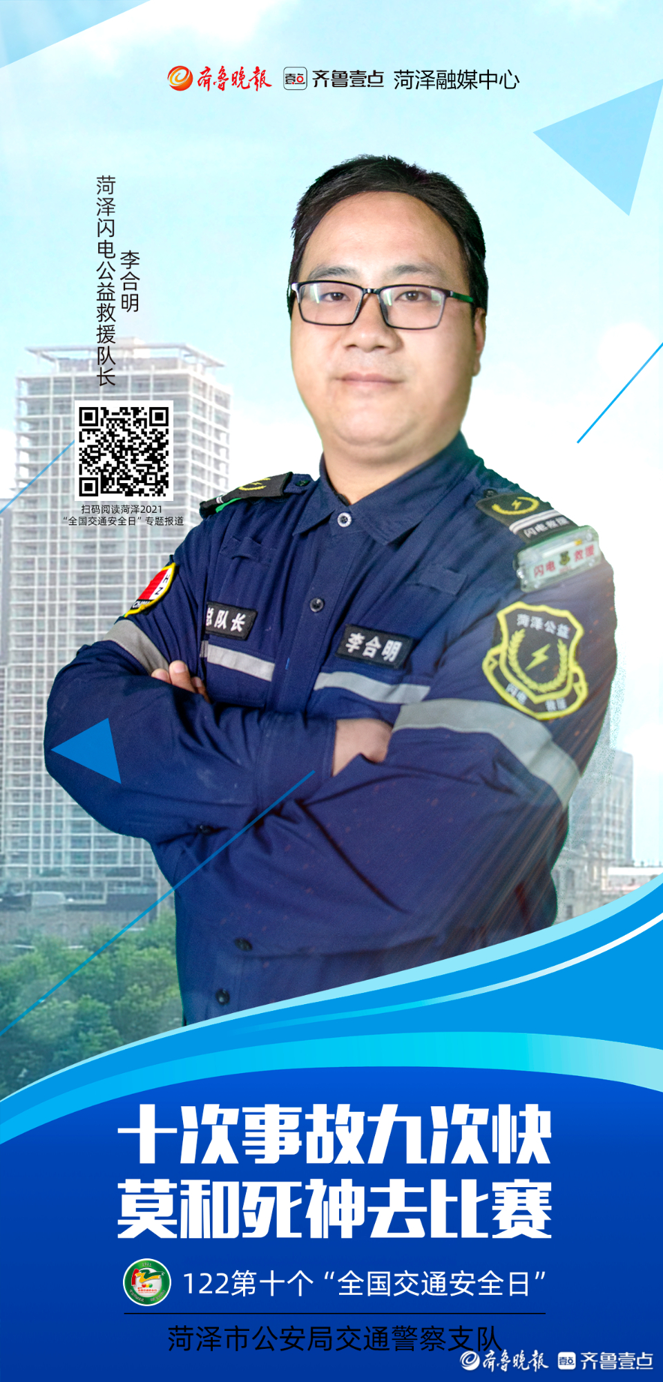 今年12月2日是第十个“全国交通安全日”。为进一步做好系列宣传活动,从源头上预防和减少道路交通事故,菏泽市公安局交通警察支队联合齐鲁晚报·齐鲁壹点菏泽融媒中心推出第十个“全国交通安全日”系列海报。海报以菏泽市公安局交警支队支队长李合力和菏泽市公安局高速交警支队支队长李洪淼的寄语为开篇,各行各业代表为“交通安全”代言,用通俗易懂的方式提醒市民交通安全的重要性。