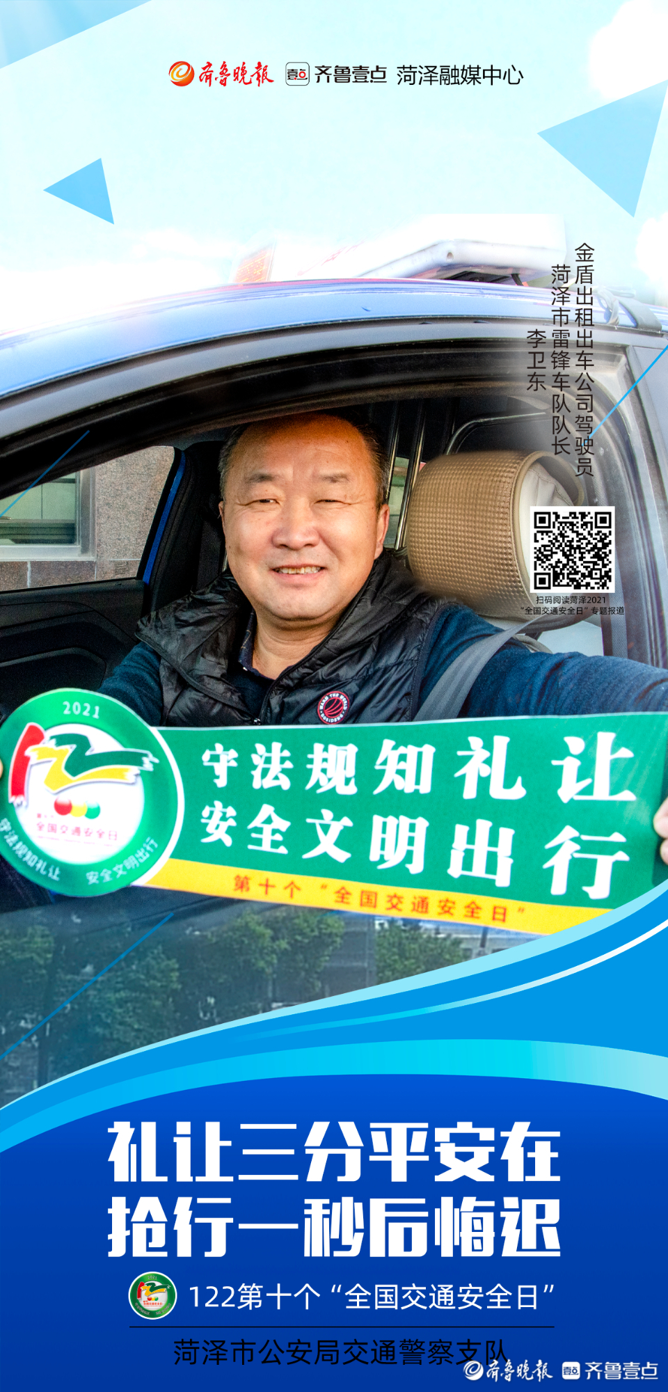 菏泽市雷锋车队队长李卫东说:“通过122“全国交通安全日”宣传活动,我明白了交通安全是非常重要的。作为一名出租车司机,更应该做守法规、知礼让的表率。接下来,我要更加增强礼让行人、文明出行的意识,自觉抵制违法行为,做一个合格的交通参与者。”