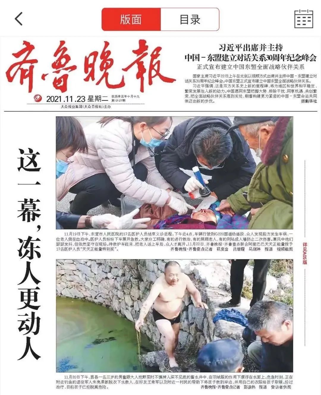 水池深不见底,幼童命悬一线,家人慌乱中大哭。瑟瑟寒风中,他如神兵天降,脱衣入水,力挽狂澜。纵冰水刺骨,英雄无惧无畏。那个光着身子焦急奔跑的身影,那句低调坚定的“这是我该干的”,书写了一个退役军人不曾褪色的军魂,也定格了一个大写的齐鲁男儿。奖励致敬,好汉值得!