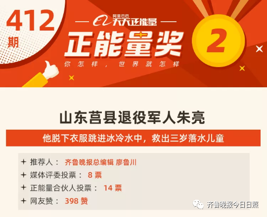 日照朱亮好样的!他跳入冰水救出3岁孩童获评阿里巴巴天天正能量