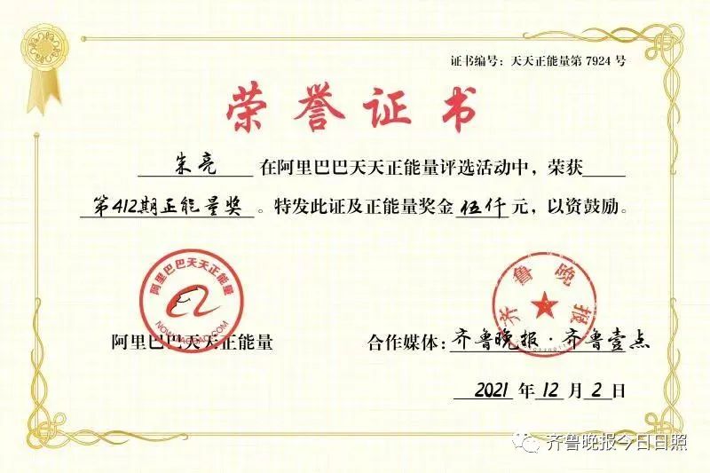 此事迹感动了很多读者和网友,也获得阿里巴巴天天正能量公益平台的肯定。阿里巴巴天天正能量和齐鲁晚报·齐鲁壹点将为他颁发荣誉证书,以及5000元的正能量奖金。